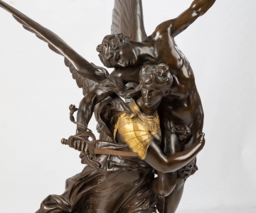 A French parcel-gilt bronze figure group entitled 'Gloria Victis' The figure cast by Ferdinand Barbedienne from the model by Marius-Jean-Antonin Mercié, Circa 1880 The naturalistic base inscribed A. MERCIE, on a circular plinth inscribed to the front GLORIA VICTIS, and to the reverse F. BARBEDIENNE, FONDEUR/PARIS, with Réduction Mecanique stamp. |
