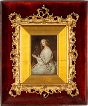 | Lot #: 29 Hand Painted Porcelain Plaque of a Young Woman Playing a Viola da Gamba |