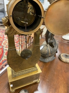 19th century with Lyre shaped with swans, winged ladies and an eagle. 8 day time and strike movement. Retailed by the Van Heusen & Charles Co, Albany, N. Y. |