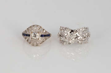 Left: 18k Gold, diamond and synthetic sapphire, rose cut diamond melee, center old European cut approximately .30 cts. 3.13 grams, ring size 8, 20 x 15 mm. Right: 14K Gold & Diamond, approximate total weight 1.60 cts. 9.1 grams, ring size 6, 22 x 12 mm. |