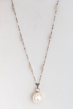| Lot #: 258 Platinum, Natural Pearl and Diamond Necklace |