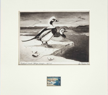 Lee LeBlanc (American, b. 1913-1988) Stellers Eiders, 1973 Federal Duck Stamp Print (ed. 150/1000), 1973 Four color photo-lithograph, 9 x 11 in. Leslie Kouba (American, 1917-1998) Old Squaw Ducks, 1967 Federal Duck Stamp Print, 1967, Drypoint aquatint etching, 8 x 10 in. Stanley Stearns (American, 1926-2013) Blue Geese, 1955 Federal Duck Stamp Print, 1955, Aquatint etching on paper, 7.25 x 10 in. Leslie Kouba (American, 1917-1998) Canada Geese, 1958 Federal Duck Stamp Print, 1958, Stone lithograph on paper, 6.75 x 9.25 in. Maynard Reece (American, b. 1920) King Buck, 1959 Federal Duck Stamp Print, 1959 Stone lithograph, 6.5 x 9 in. |