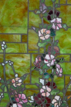 Attributed to Duffner & Kimberly. Early 20th century. stained and leaded glass. (2) windows nearly identical. Each with red, orange and pink hollyhock stalks on a yellow / green iridescent glass background. |
