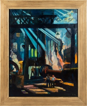 circa 1920. Oil on canvas. Signed (lower right). Ennis created a series of paintings for Bethlehem Steel Works in 1918. Twenty-eight drawings and watercolors were first exhibited at the Corcoran Gallery in November, 1918. The oil paintings were on exhibit at the Sherwood Studios (NYC) in December 1918. The oils included Forge of Vulcan, Forging the Guns, Proving the Guns, Blowing Steel, Pouring Moulds, Ore Beds, Blast Furnaces, and Forging Torpedo Heads. These works were created to highlight the role of American industry in the war effort (WWI). |