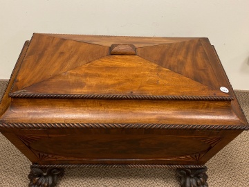 Early 19th century. Highly figured mahogany with carved fans and gadrooning. casket form with claw feet and brass mounts, lead lined. |