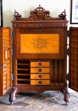 | Wooton Desk Company, Indianapolis, IN. Patented 1874. Carved walnut and burl with figured maple engraved lid. Appears to be original finish. |