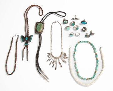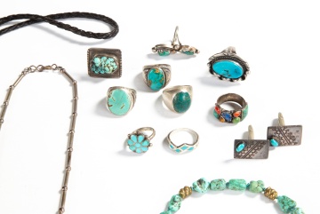| Lot #: 123 Bolo Ties, Silver & Turquoise Rings, Necklaces |
