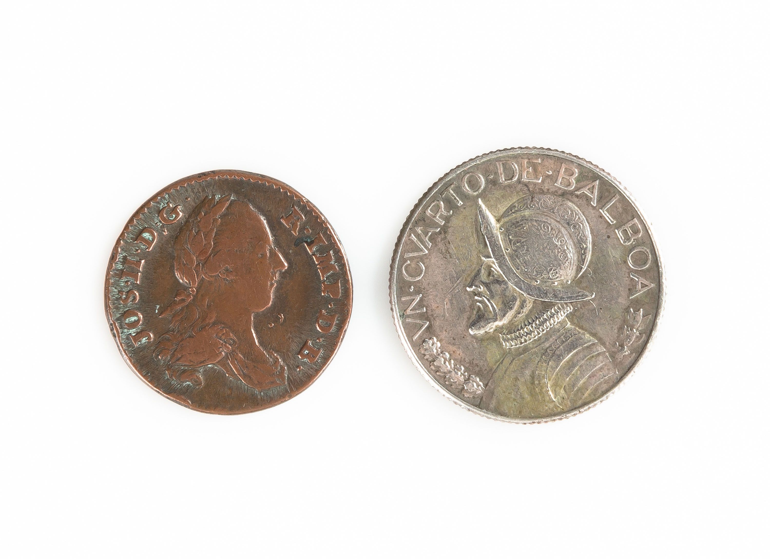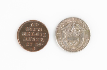 | Lot #: 139 1932 Panama 1/4 Balboa Silver Coin & 1789 Joseph II Liard Copper Coin & Roman Coin |