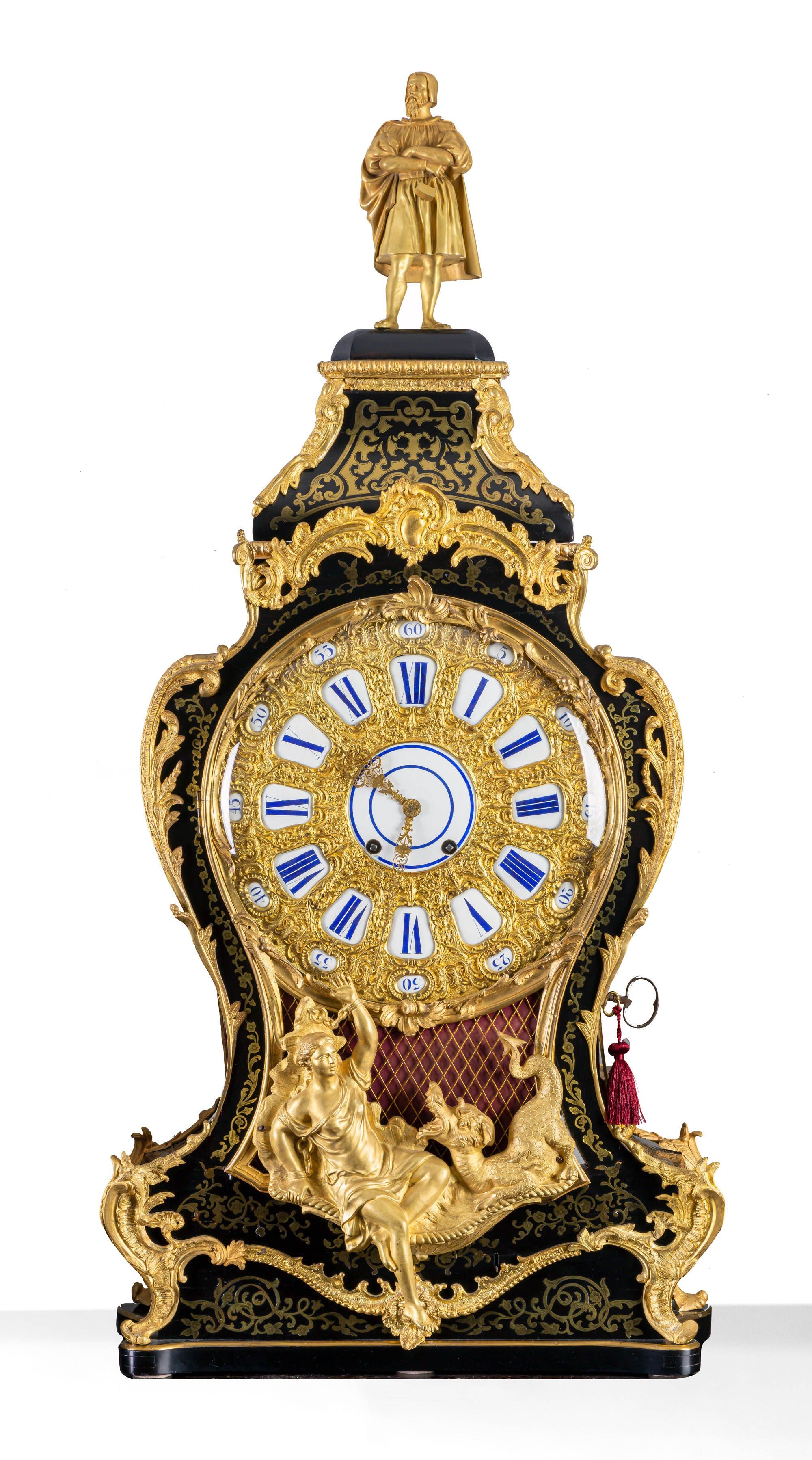 Circa 1750, ebonized wood and brass boulle case, 15½ in. 25-piece cartouche dial with finely pierced hands and leaf-cast bezel, square plated two train quarter repeating movement with verge escapement, quarter repeating on two bells, the strike work mounted on the back plate, releasing the organ on the hour, massive Swiss organ movement in the base with twin barrels and tandem winding twin fusees, pinned wood barrel playing eight airs on seventeen pipes and a pair of bellows, inlaid with foliate brass design, outlined in rococo C-scroll, shell and leaf mounted, the front with an allegorical figure and baby dragon mask, concave cresting surmounted by an associated ormolu figure of Charles Martel called ‘Martel the Hammer’. |