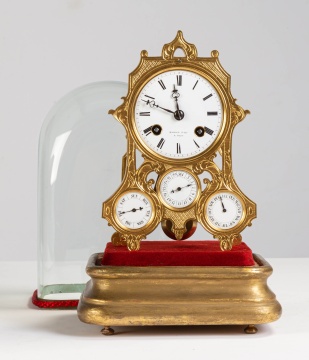 Easel form with three subsidiary dials, day, date and month, time and strike movement with anchor escapement. Movement and dials signed Raingo Freres, Paris. Supported in a gold leaf base with glass dome. |