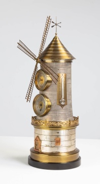 The silvered bronze case is in the form of a windmill displaying the time on a silvered dial with additional displays of barometric pressure and multi-temperature reading thermometers. The clock movement goes eight days with a platform escapement timepiece movement. The vanes of the windmill turn continuously for several hours quite engagingly. They are powered by a separate automation movement located within the base, which is wound through the small door in the front. |