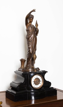 Bernoux of Paris, circa 1875.Black marble, bronze statue is after culptor, Auguste Nadaud. 8-day movement with an hour and half-hour bell strike and a unique filitrice pinwheel detent escapement. The movement signed Bernoux, Paris, Brevete. |