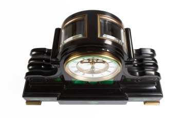 Slate, Malachite with bronze mounts. Porcelain enamel dial, Brocot escapement, back plate stamped AB within a star, Achille Brocot (1817 - 1878) & numbered 6392. |
