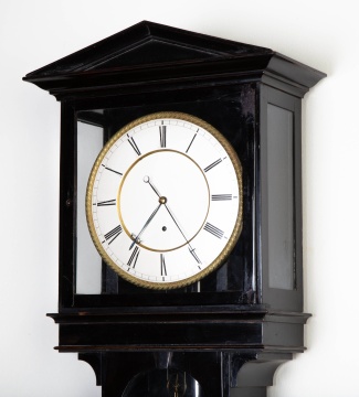 circa 1810. Ebonized case, finely engraved, painted dial, cast gilt brass bezel. brass time only movement of at least one month duration. |