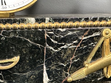 19th century, ormolu on Verde Antico marble, 4 in. porcelain enamel dial, with roman numerals. 8 day time and strike. |