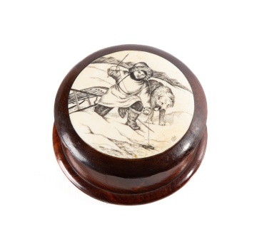 | Artist signed and engraved bone depicting an Eskimo and sled dog ice fishing, mounted on a carved walnut. |