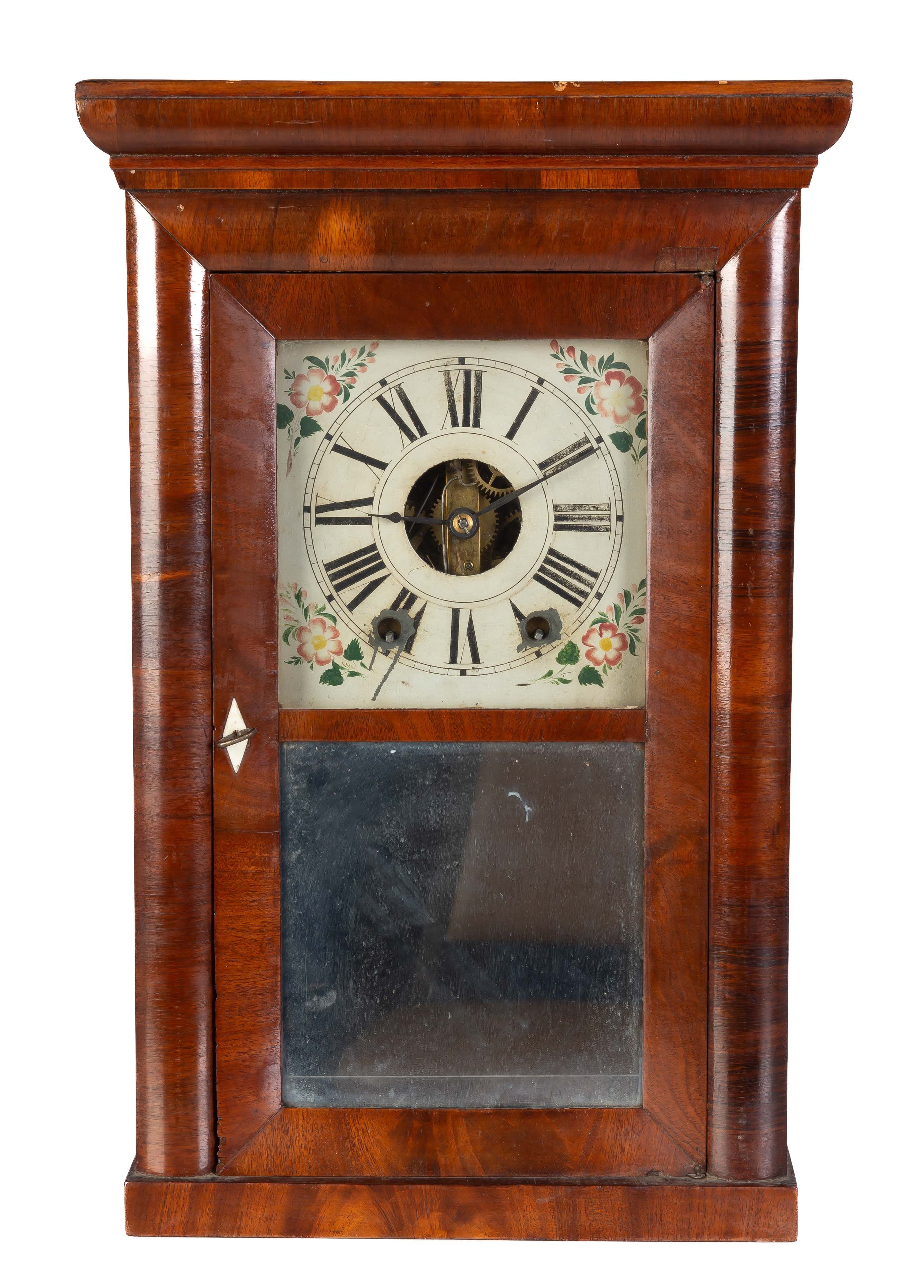 | Mahogany case. Original finish, dial, and glasses. 30 hour. Calling card manufacturers label. |