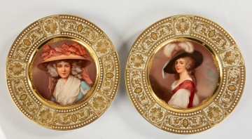 Hand-painted porcelain, paneled border, gilt with foliate scrolls edged with opal jewels. Signed with blue scepter mark (on reverse) and artist signed Wagner. Includes: Duchess of Gloucester, Lady Milness, Duchess of Devonshire, Mrs. Graham, Lady Tykell, Miss Hallet, Lady Lyndhurst, Mrs. Sheridan, Lady Sheffield & Mrs. Blessington. |