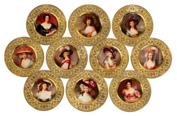 | Lot #: 44 (10) Berlin K.P.M. Porcelain Jeweled Ivory-Ground Portrait Plates |