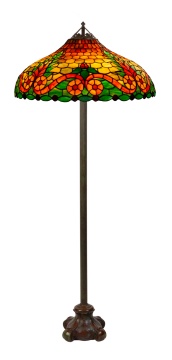 Early 20th century. Leaded glass and patinaed bronze. Shade and base signed HANDEL. |