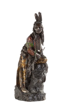 However the majority of scholars feel that the artist actually never traveled to the United States at all, but instead relied upon the accounts of others and first hand artifacts to execute his bronzes. Without a doubt, his work is most worthy of artistic merit. His bronzes, all produced in Austria, were of the American West. The polychrome finish, intricate detail, and the realistic forms make Kauba’s sculptures excellent examples of Viennese bronzes at the turn of the century. Most were cast for the American market between 1895 and 1912 and were widely advertised and sold by Latendorfer in New York during the 1950’s. In contrast to most artists, Kauba’s business successes were equal to his artistic achievement.