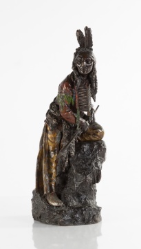 Early 20th century. Cold-painted and patinated bronze. Depicting a Native American with rifle. Signed "C. Kauba" and impressed "AUSTRIA" and "GESCHÜTZT' (on base). |