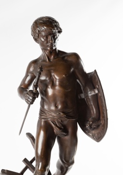 Patinaed bronze by Mathurin Moreau, black slate pedestal with gilt bronze mounts, marble dial with roman numerals. 8-day time and strike movement. |