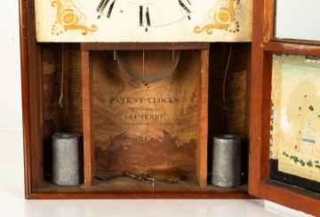| Eli Terry & Sons Plymouth, Connecticut. Circa 1830. Cherry and mahogany case. Original painted wood dial and reverse painted tablet. 30-hour 5 arbor wood movement with count wheel strike. Label "Patent clocks, Invented by Eli Terry. Made and Sold at Plymouth Connecticut by E. Terry & Sons." |