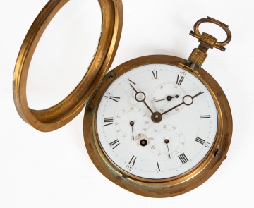 Circa 18th century. Brass and jeweled hand chased case. Painted porcelain dial with Chinese characters, Roman and Arabic numerals. Elaborately engraved back plate, duplex escapement. |