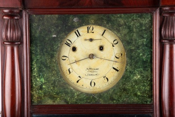 | Auburn, New York, early 19th century. Carved mahogany case, original painted metal dial, original zinc and painted tablet and mirror. 8-day time and strike. |