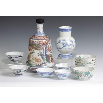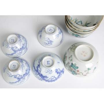 | 5 decorated Japanese porcelain bowls, Ht. 2 1/2" Dia. 4 3/4". 4 Sgn. blue & white porcelain cups with dragon design, (1) Ht. 2" Dia. 4 1/4" & (3) Ht. 2" Dia. 3 3/4". |