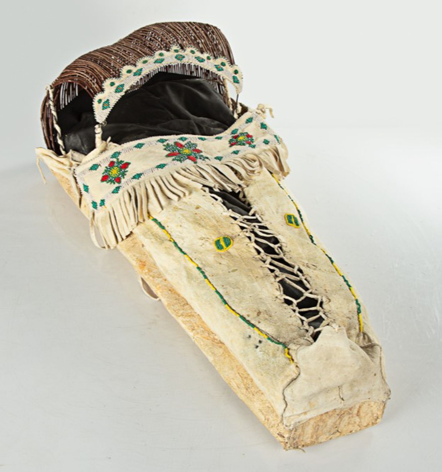 | Early 20th century, beaded hide, and wicker. |