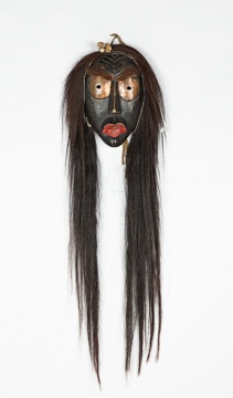 | Early 20th century. Carved and painted wood, horse hair, metal, and tied tobacco bags. |