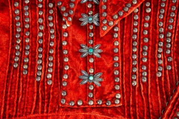 | Dine of the Navajo Nation, circa 1950. Velvet and cloth with silver and turquoise embellishments. |