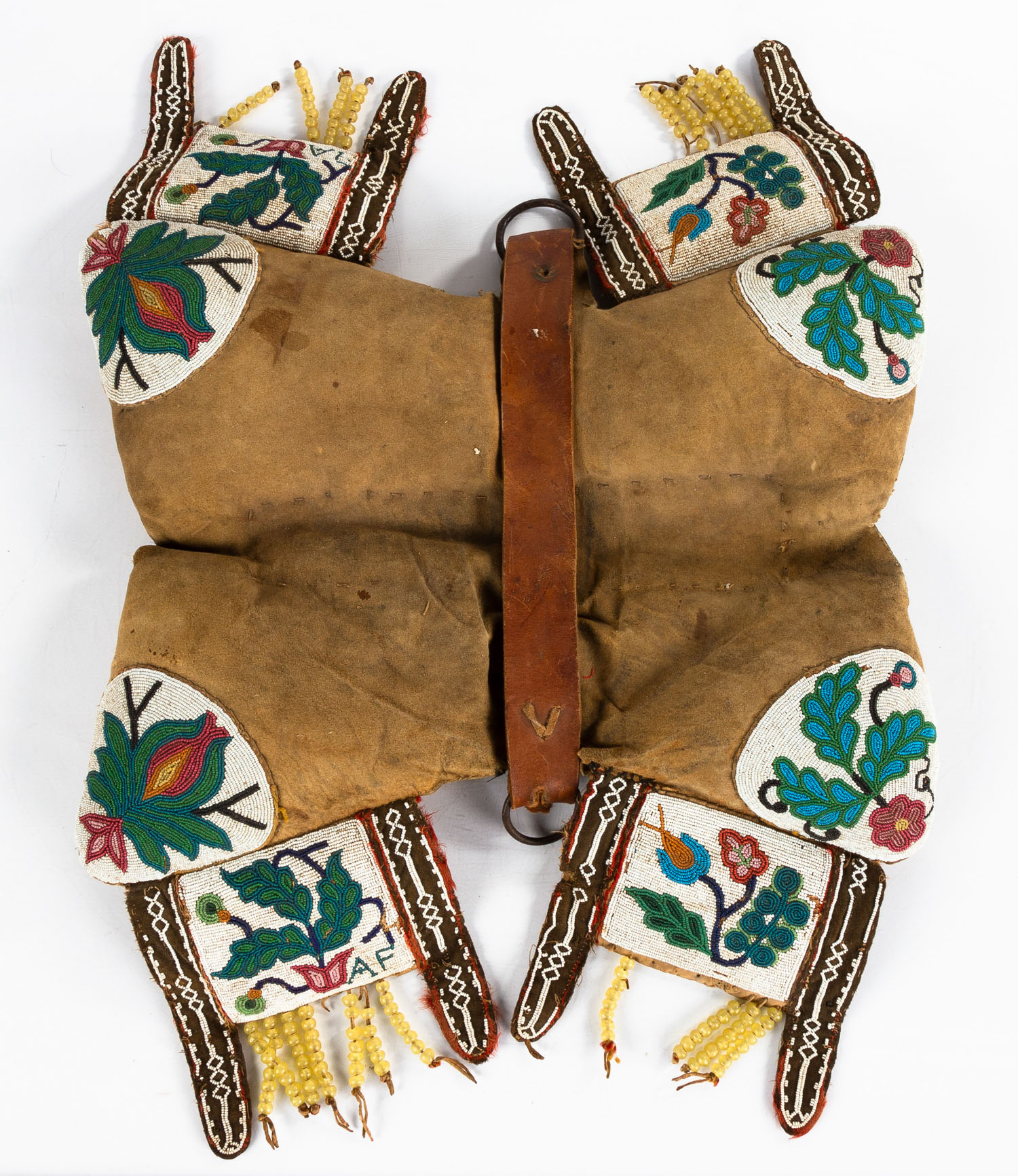 | Circa 1880. Beads, raw hide, metal, thread. |