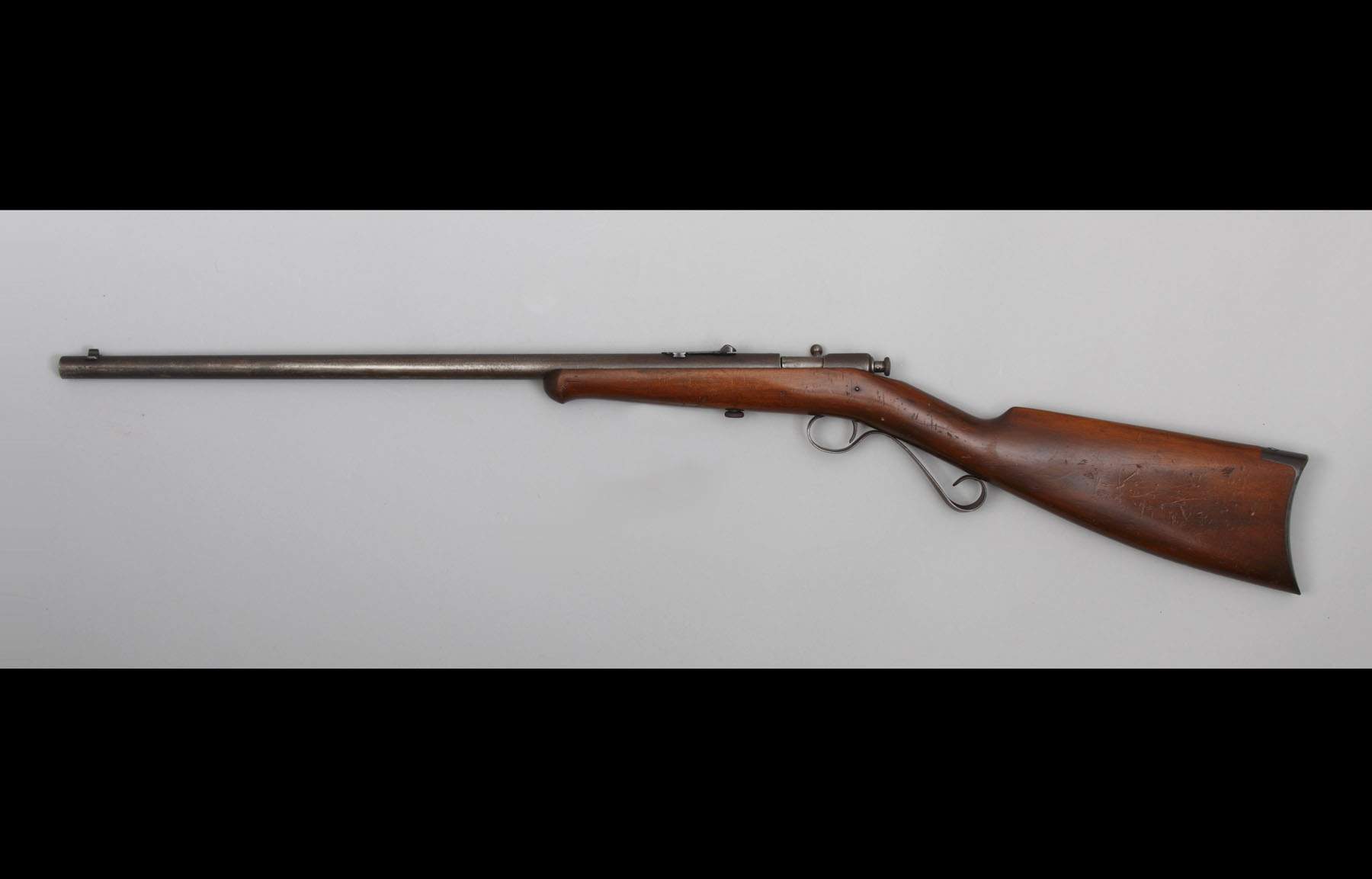 | No serial number. 22 Short, Long & extra long caliber. 24" barrel. Bolt action. Original sights. Nice wood on this perch belly stock. Est. $300-$500 |