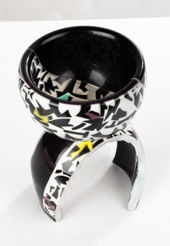 | Two-piece sculpture - the bowl sits on a horseshoe-shaped base. Blown and cased glass, sandblasted with broken enamel. Inscribed 'Concetta Mason c.' to black coloring and 'Minuet / SE 3172 / 2 of 8' to base. Blind-stamp 'CM' near bottom of bowl. Bowl - Ht. 3 1/2 in. Dia. 5 1/2 in. Base: Ht. 5 x 5 x 3 in. |