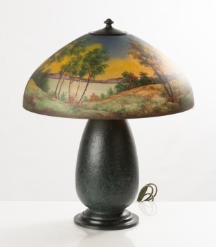 | Early 20th century, reverse-painted chipped ice shade, patinaed metal base. Signed '2616 Jefferson Co. F.' |
