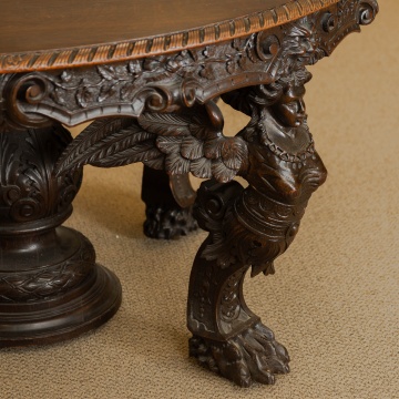 R. J. Horner & Co., New York, circa 1880. Elaborately carved quarter-sawn oak with winged woman, paw feet, dragooning, and foliate design border. Extendable dining table with four 14-inch leaves. |