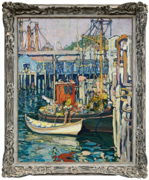 Oil on canvas. Signed 'JANE PETERSON' (lower left). Adhesive inventory label (behind frame). Original carved wood frame. Likely Exhibited: Rochester, New York, The Memorial Art Gallery, An Exhibition of Paintings by Jane Peterson, Frank Townsend Hutchens and Other Contemporary American Artists, Feb. 1917. Exhibition catalog pg. 2 (A Pier at Gloucester, No. 9). |