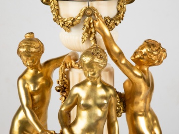 Late 19th century. White marble base having a fluted pedestal topped with an urn with dore bronze handles & trim, strands of garland and a bronze mounted lid with pineapple finial; standing around the urn are 3 nude female figures (three graces). The 4.5 in. dial consists of 2 porcelain rings, one with black Roman hour numerals and the other with 5 minute Arabic numbers and minute markers with an arrow indicator. The brass movement has a silvered lever platform escapement and strikes on an internal bell on the half hour. |