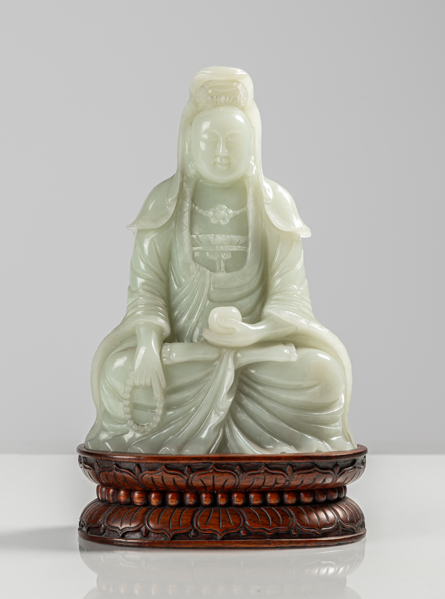 China, Qianlong (1735-1796). Seated figure in hieratic posture wearing meticulously folded robes and hood. In one hand she holds a pearl, from the other hangs her rosary. In grayish white jade of uniform tone with high polish. On a carved wood stand. Weight: 1961.9 grams. Note: Buddhism thrived during the Qing dynasty, supported by the devotion of emperors such as Kangxi, Yongzheng, Qianlong, and their successors. This widespread popularity led to the extensive production of Buddhist statues, ritual objects, vessels, and other implements, made from a variety of materials. Although jade was one of these materials, large jade figures of Buddhist deities seem to be quite rare. |