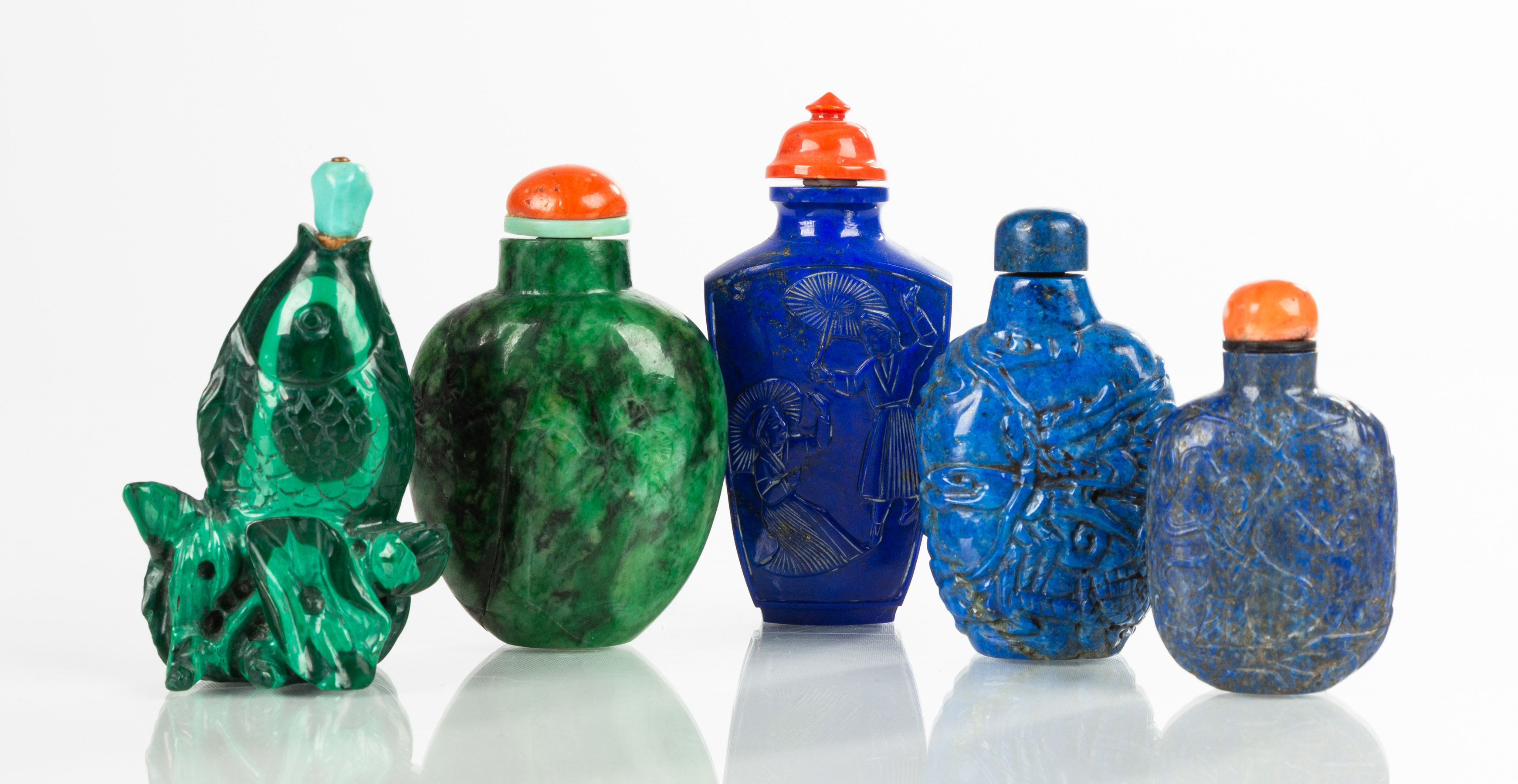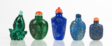 | Lot #: 20 Five Lapis Lazuli & Malachite Snuff Bottles |