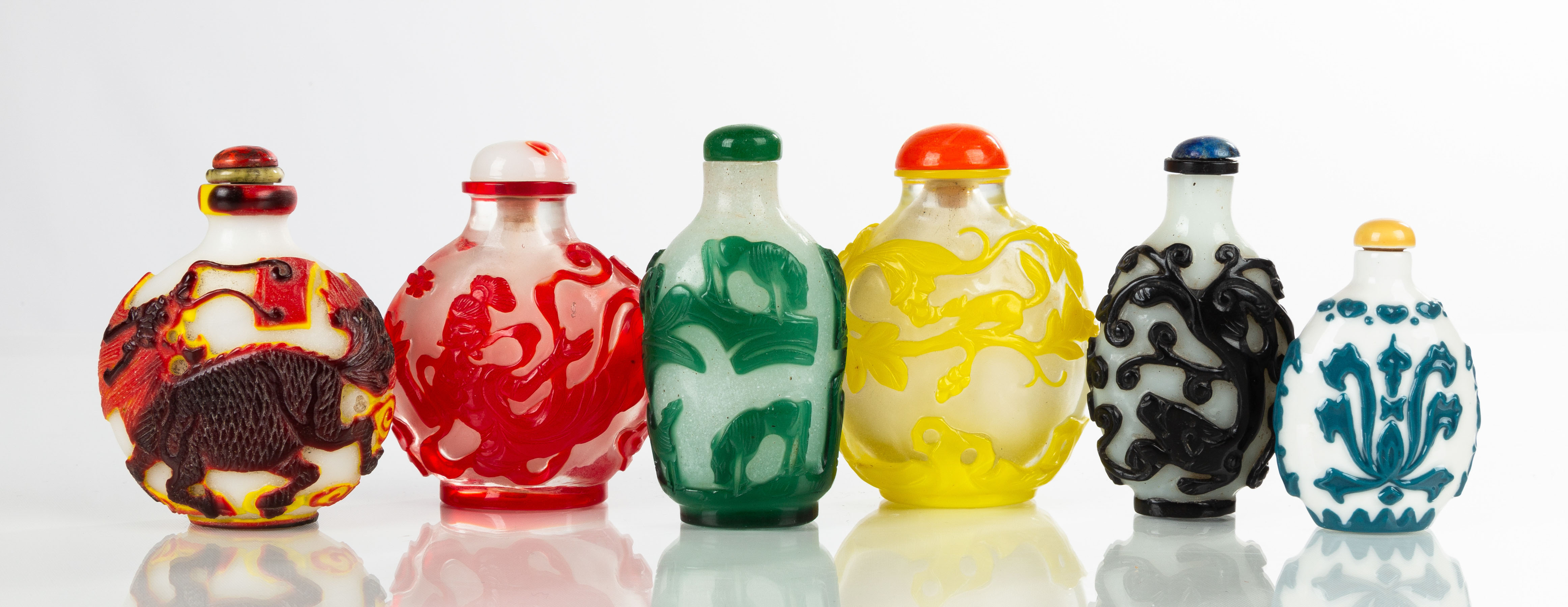 | Lot #: 23 Six Peking Glass Overlay Snuff Bottles |