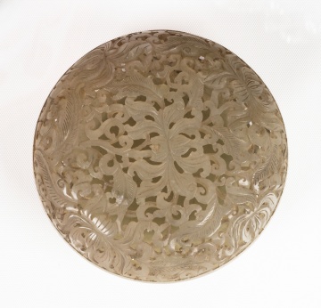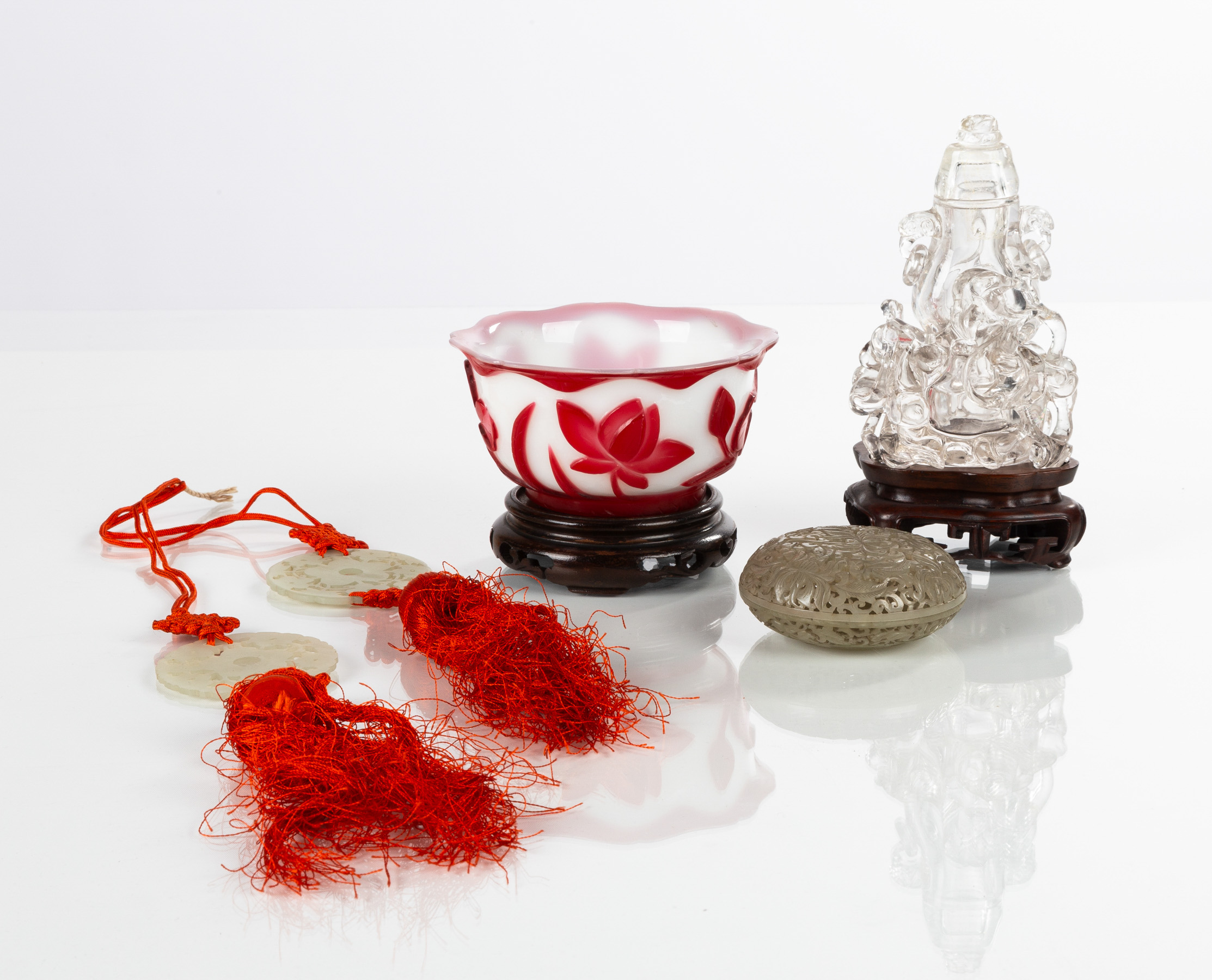 Including Chinese Peking cameo glass bowl, rock crystal carving, jade plaques, and covered box. |