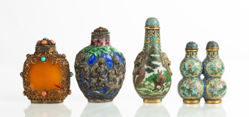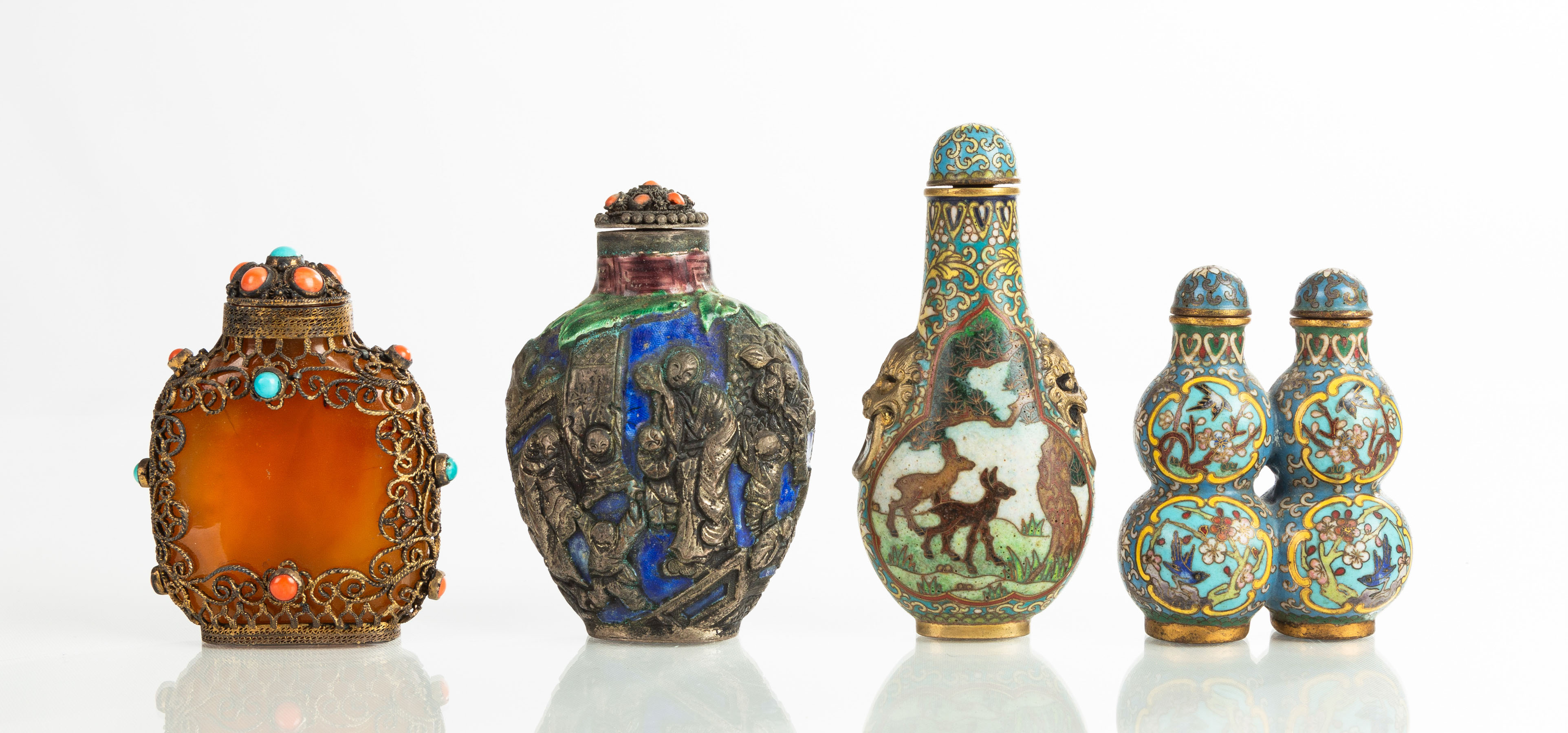 | Cloisonne bottle and double gourd form, agate with filigree mounts, polychrome painted silver. |