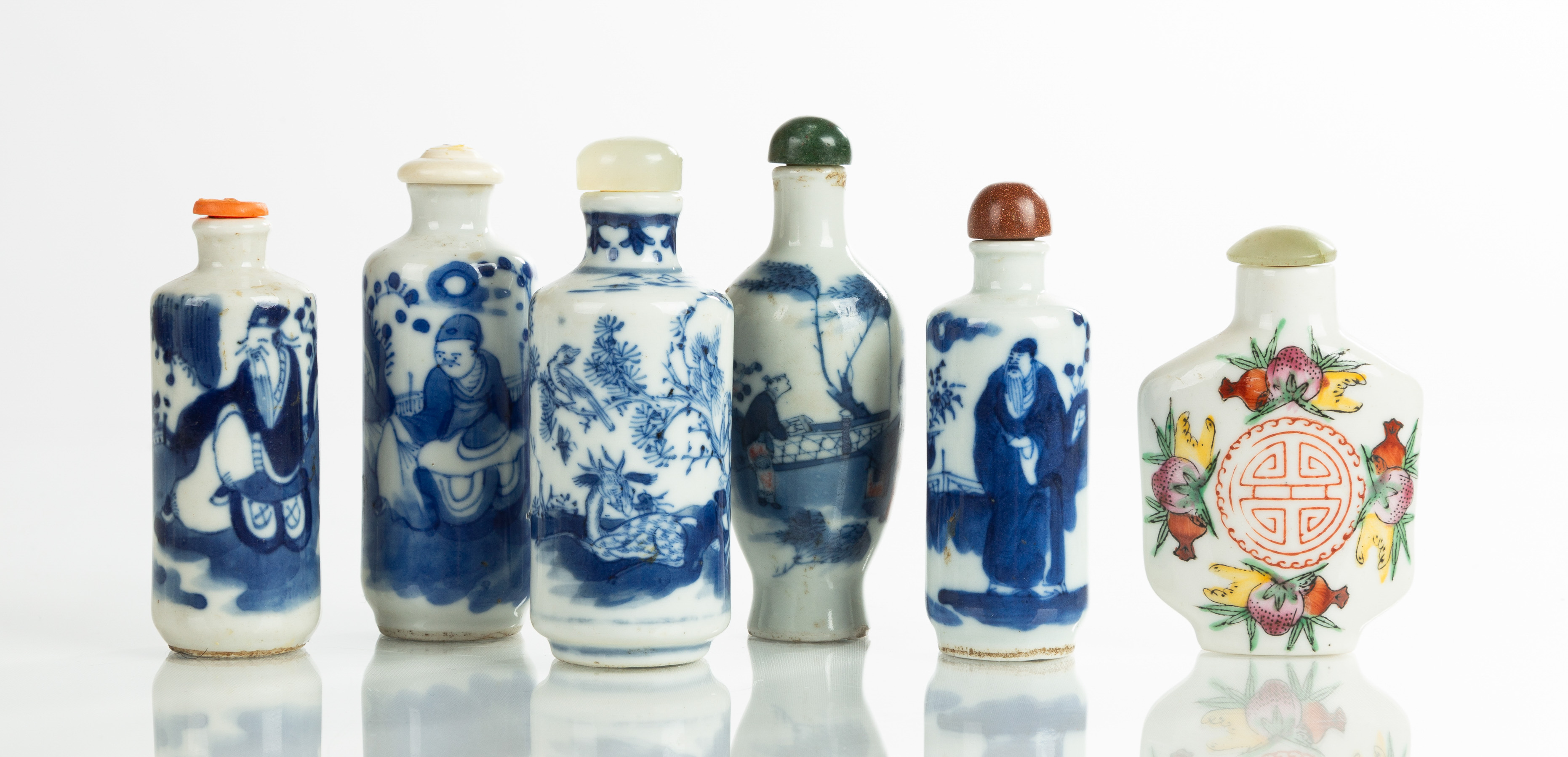 | Lot #: 30 Porcelain Blue and White & Polychrome Snuff Bottles |