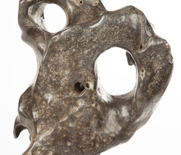 Late 19th/early 20th century. Known as gongshi, or scholars' rocks, lingbi stones. Upright, pierced rock is of blackish-grey color, with a wooden branch imbedded into the stone. Signed and inscribed. |
