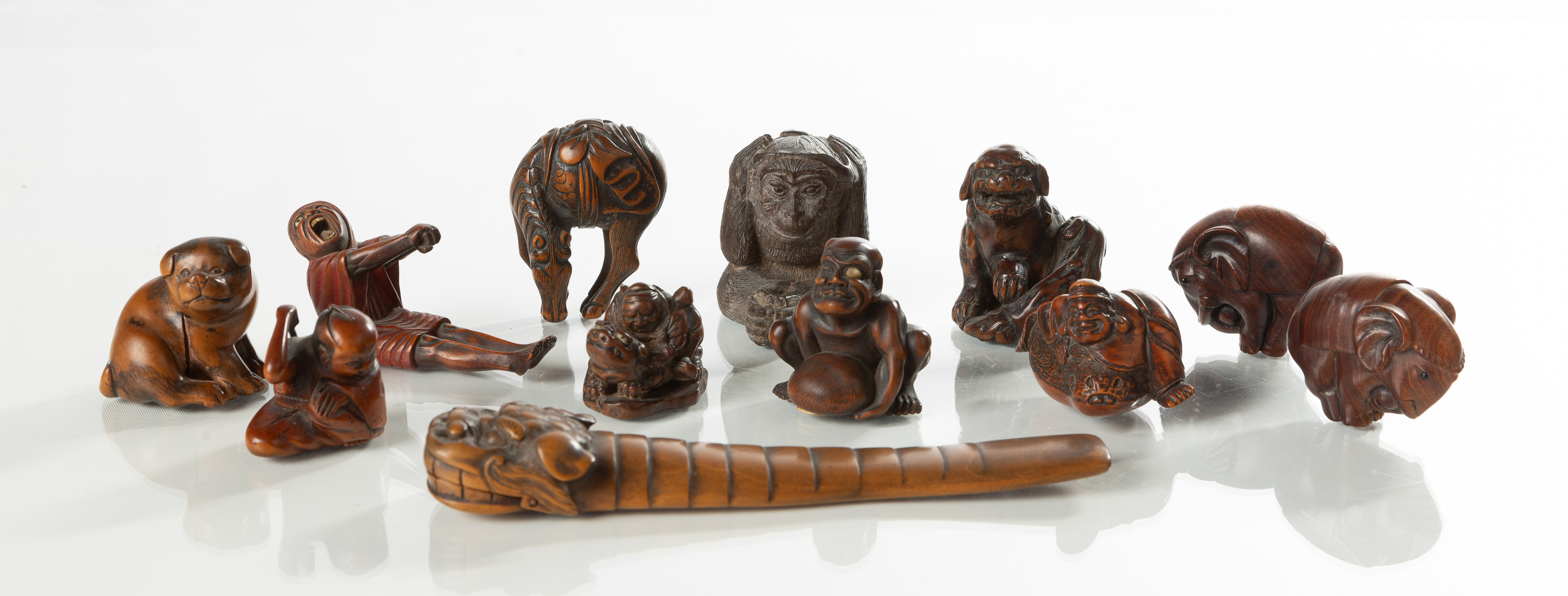 Edo (1615-1868) to Meiji period (1868-1912). Carved in exotic woods. Several are signed. |