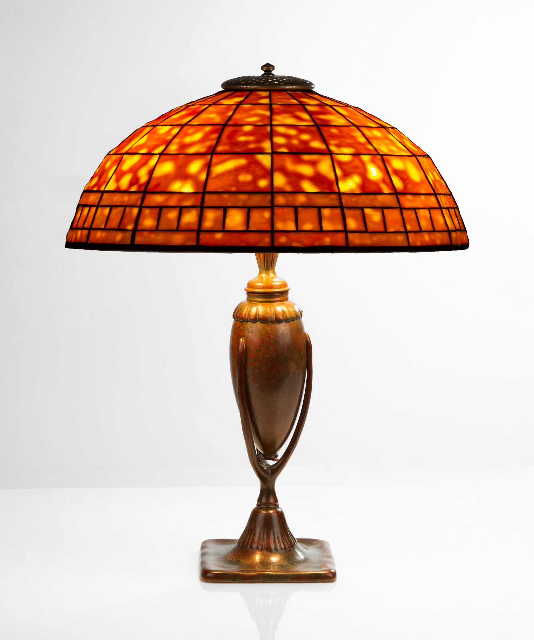 Circa 1910, leaded glass and patinaed bronze. Shade impressed 'TIFFANY STUDIOS NEW YORK'. Base impressed 'TIFFANY STUDIOS NEW YORK 444'. |